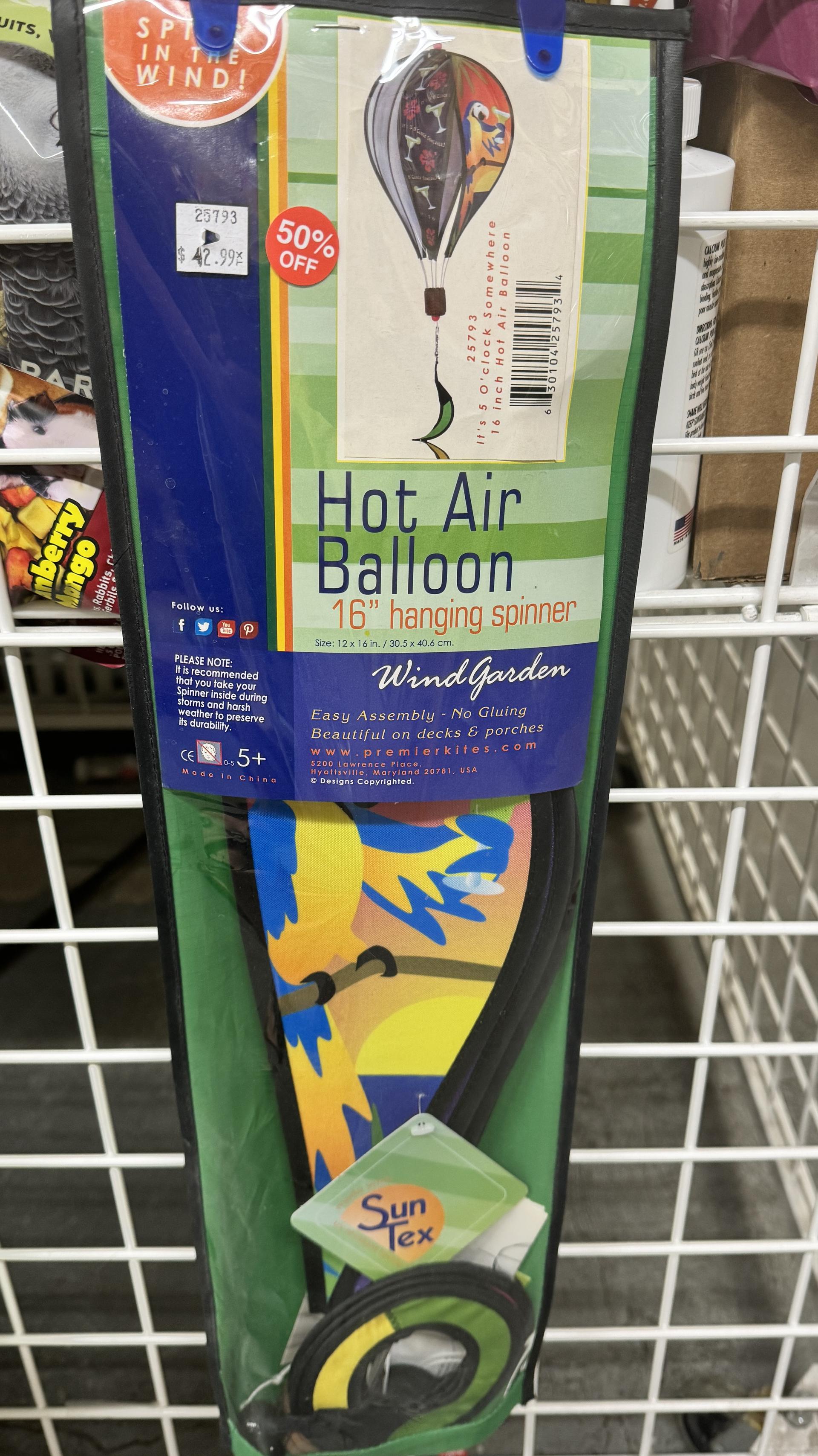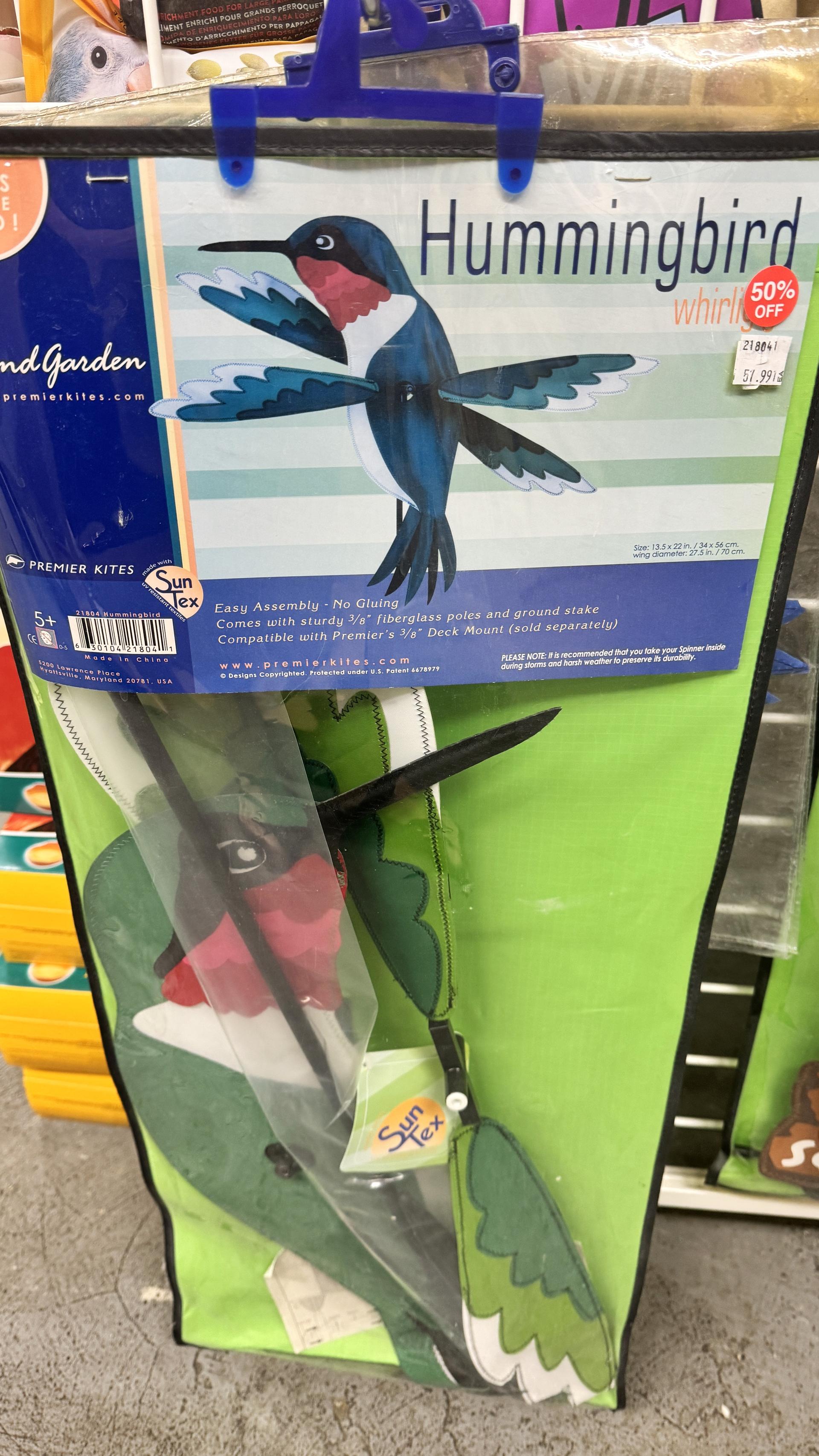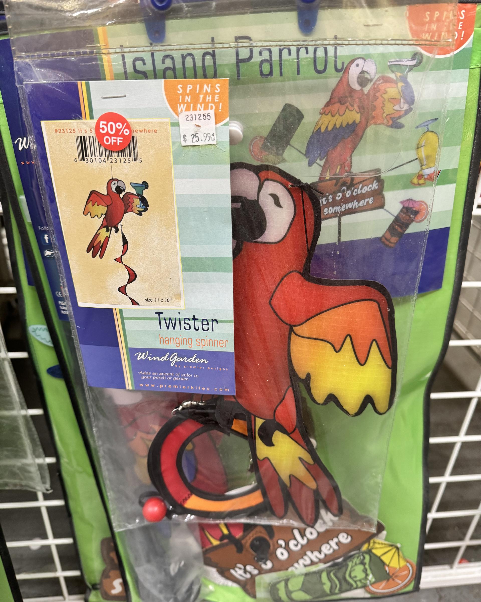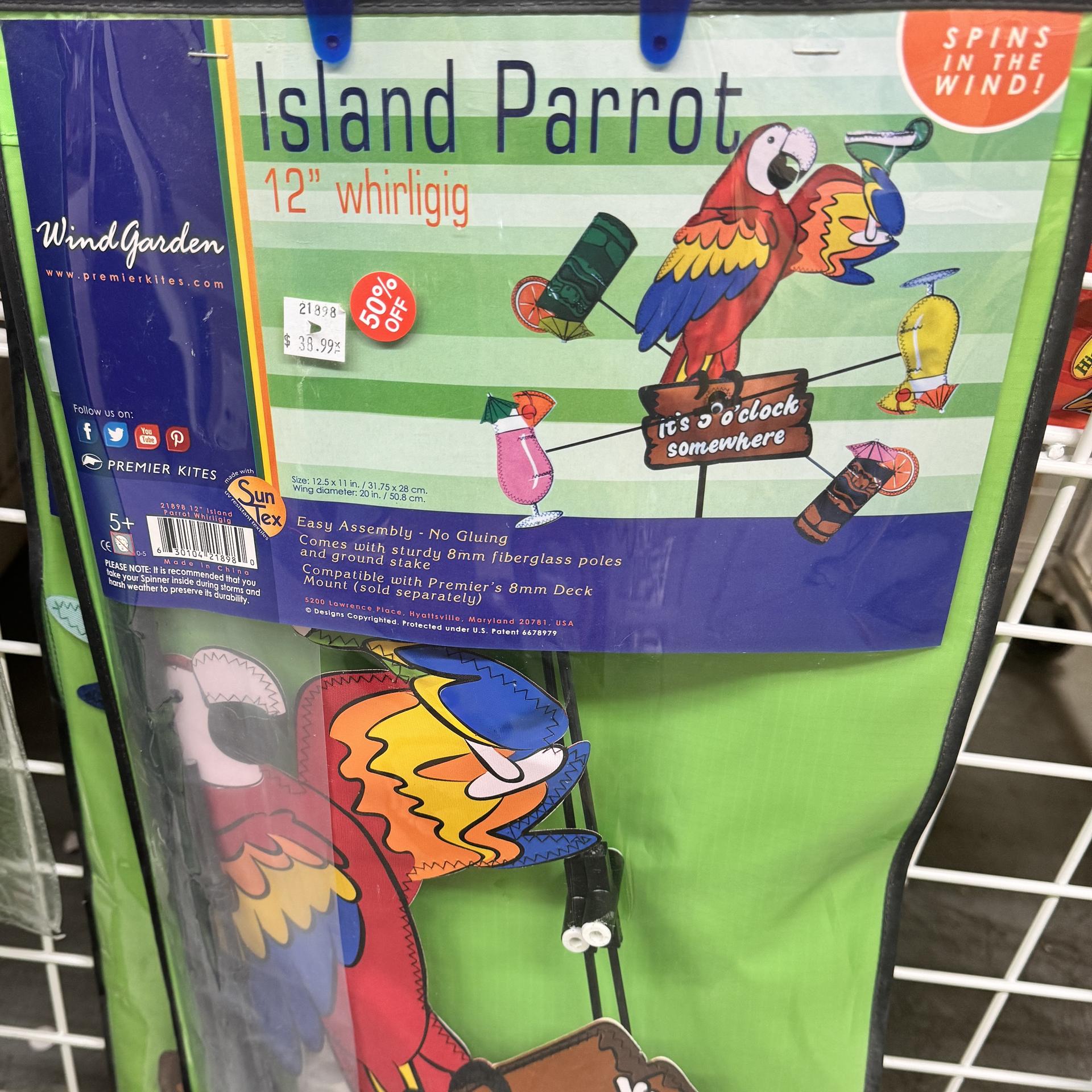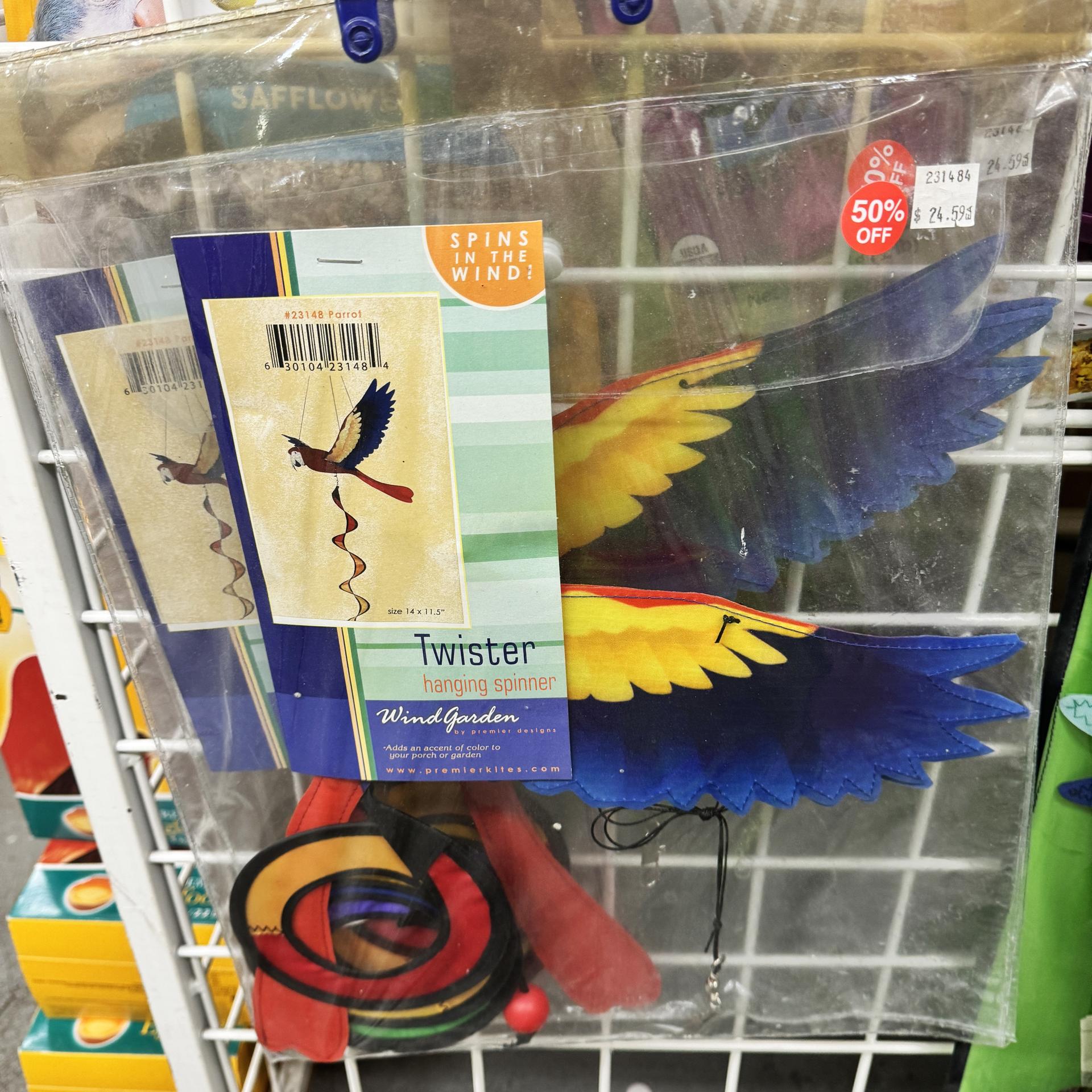 Adorable wind socks, spinners and outdoor parrot decorations. 1/2 price!!